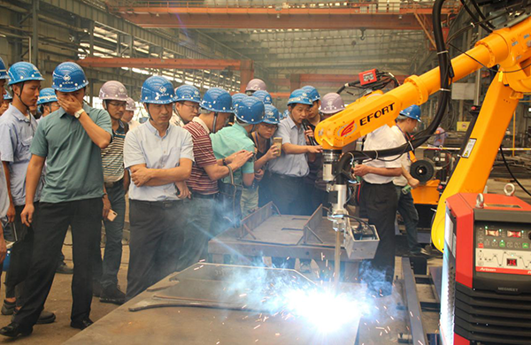 在蕪船三山新廠區(qū),嘉賓們首先來到蕪船展覽館,詳細(xì)了解了蕪湖造船廠輝煌119年奮斗史,為蕪船厚重的文化底蘊(yùn)紛紛點贊。隨后參觀團(tuán)還來到了聯(lián)合工廠機(jī)器人焊接平臺、舾裝碼頭和1號船臺。來到機(jī)器人焊接平臺時,嘉賓們對機(jī)器人精準(zhǔn)的焊接水平印象深刻,紛紛圍觀;在參觀舾裝碼頭時,嘉賓感嘆近1000米沿江舾裝碼頭的恢弘氣勢和硬件條件的突出,對船舶建造水平、油漆光潔、美觀度和細(xì)節(jié)處理水平表示贊嘆,紛紛在64000噸華江807號前留影。短短不到二個小時的參觀時間,蕪湖造船廠給來訪嘉賓留下了深刻印象。嘉賓們對蕪船企業(yè)文化、硬件設(shè)施、制造能力都給予了充分的肯定,對蕪船未來的發(fā)展?jié)M懷期望。嘉賓們說:“蕪湖造船廠在國內(nèi)很有名氣,歷史悠久,是我國的老牌軍工企業(yè),今天有幸來訪,耳濡目染,看到了蕪船在智能制造、管理創(chuàng)新和提速增效等方面取得的突破性發(fā)展,相信蕪船未來的發(fā)展會更好!”